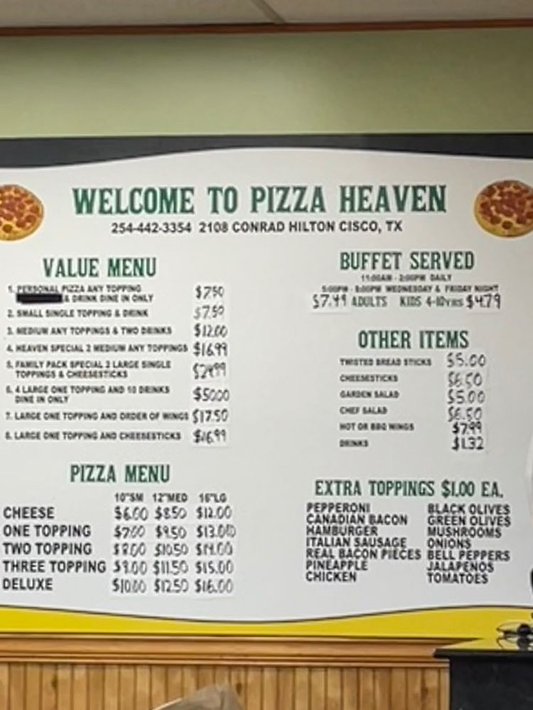 Welcome to Pizza Heaven Cisco, located at 2108 Conrad Hilton Blvd, Cisco, TX 76437. This charming pizza parlor offers a delightful menu filled with various options that promises to satisfy every palate.